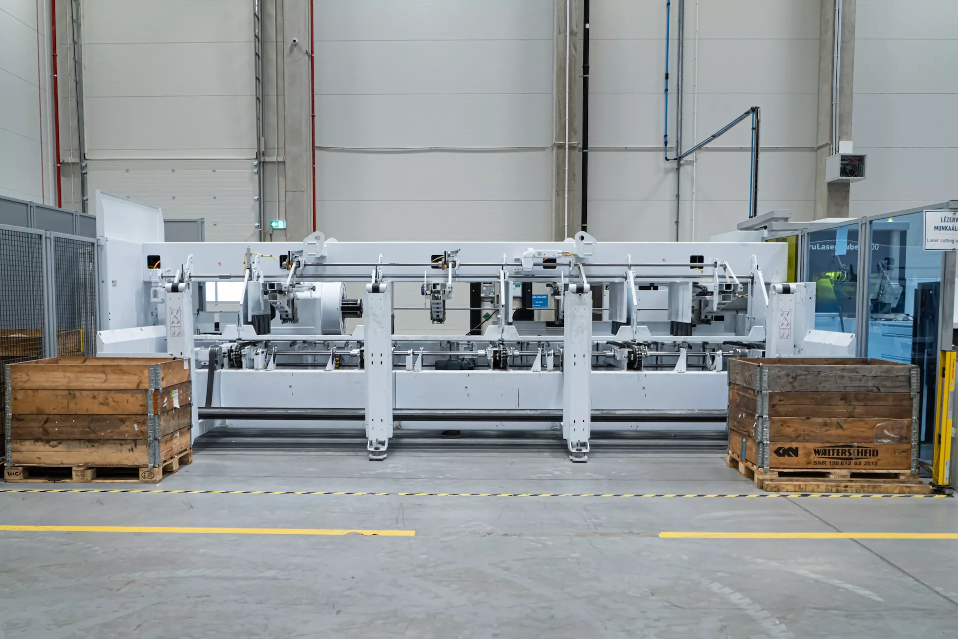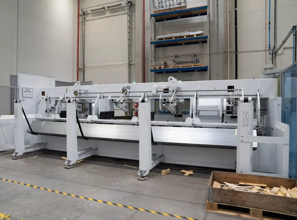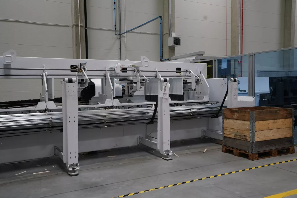 Gépágy 6,5 m-es nyersanyaghosszhoz: Stabil gépkeret nagy pontosságú, edzett vezetékekkel. Nagy gyorsulási értékek és pontosságok érhetők el.